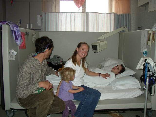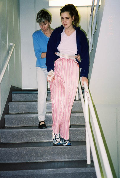 Marla walking with support from Mom and Dad, who are learning the proper techniques for walking with Marla.
