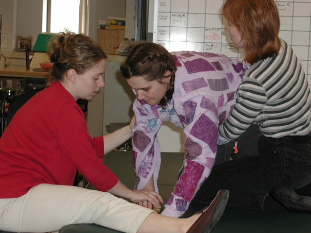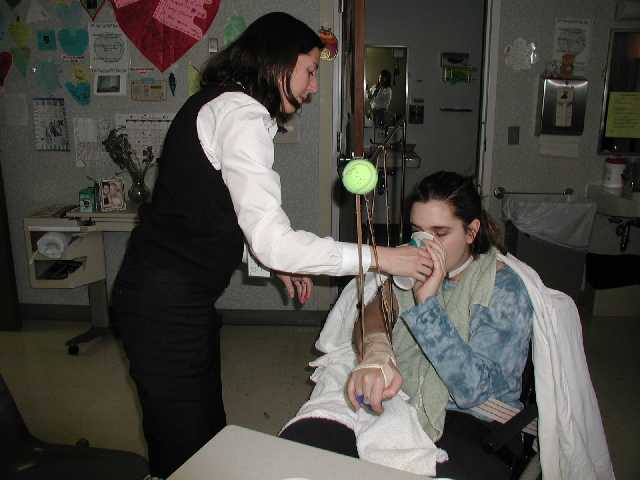 Peggy and Jean (Marla's OT and PT Therapists) working with her on the mat. They are working with her to bear weight on her injured right arm.