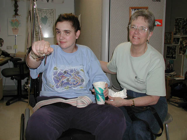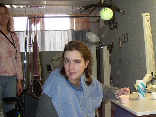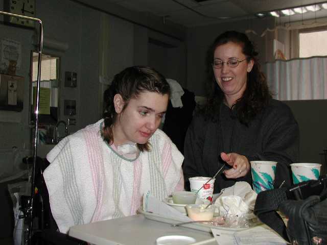 Marla enjoying lunch with Pam, one of her favorite re-habilitation technicians. Pam is getting married at the end of March!