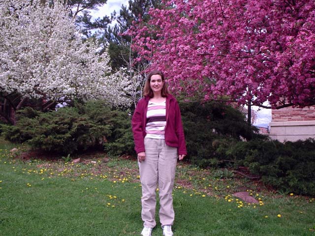 Marla pauses to admire the beautiful blooming trees on the University of Colorado campus in Boulder. She spent two days being evaluated at CU's speech science department for participation in their summer research program. The evaluators (instructors and graduate students) commented on Marla's intelligence, warmth, determination, and were amazed at how well she has already applied a variety of adaptive communication strategies on her own!