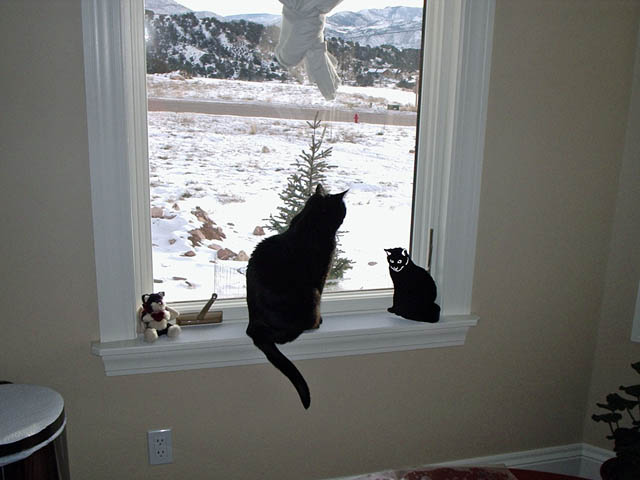Mary, Leo, and Marla enjoy the view of the mountains from the front door of their new home in New Castle. Mary has bandaged feet from her fall 2005 foot surgery. Poor footsies!