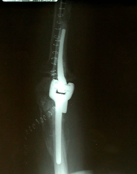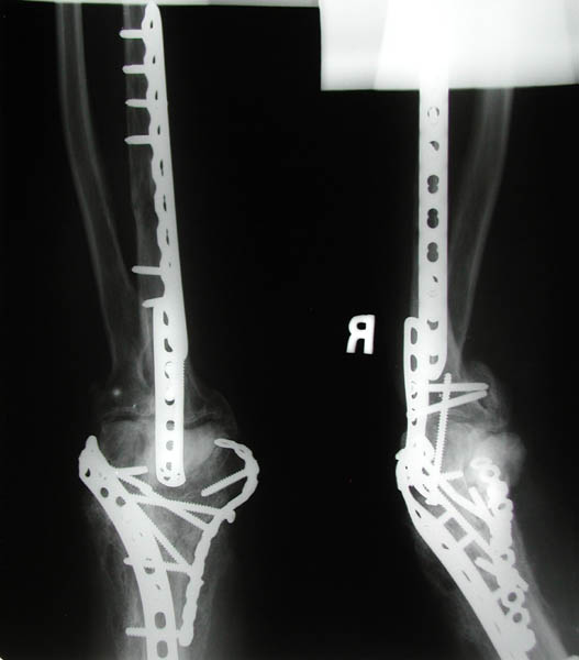 Front and side views of Marla's right elbow before her April 22nd elbow replacement surgery. The screws and plates were emplaced during the first re-construction post-trauma in December 2002. The entire infrastructure was surrounded by and interwoven with excess bone build-up, a common side effect of joint trauma coincident with head trauma. This excess bone had to be removed during her elbow replacement surgery.