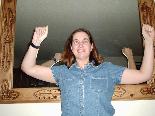 Marla shows off the progress of healing and strengthening in her right arm by raising it togive a wave.