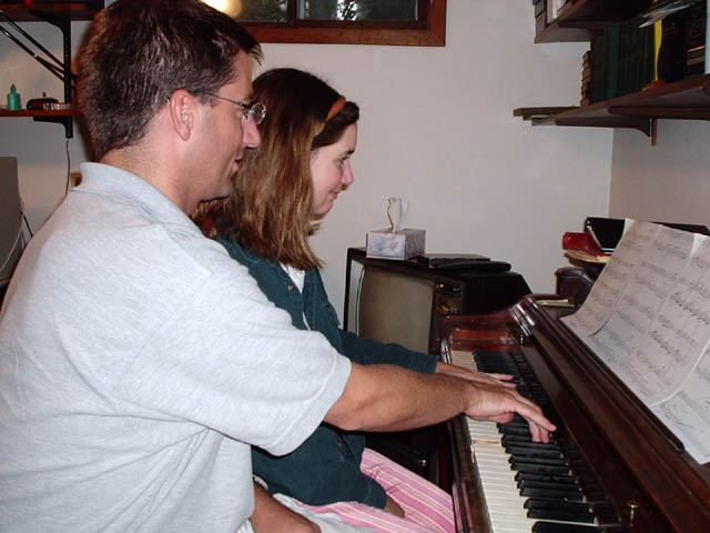 Marla plays the left hand of one of her favorite piano pieces, accompanied by Markplaying the right.