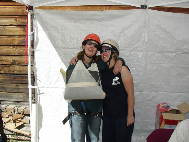 Vikki helps Sally, a BIAC volunteer from Australia, apply a sling and protective paddingto Marla's right arm, which received a new artificial elbow in April. The padding will offerprotection while Marla ascends the climbing wall!