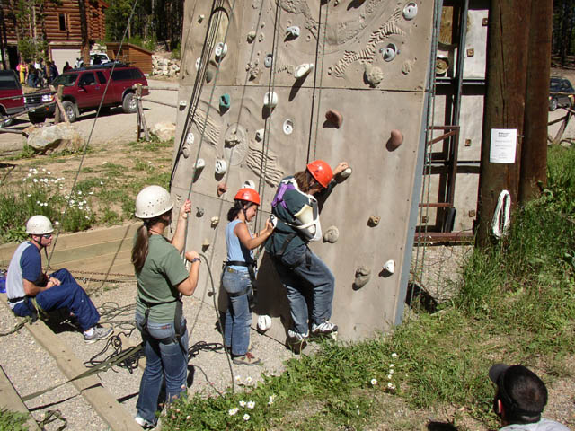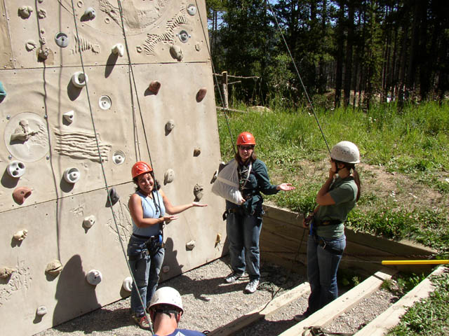 Vikki, Marla, and Emily celebrate her amazing success on the climbing wall.Early on, Marla doubted whether she could reach the top, but she climbed thewall with flying colors!