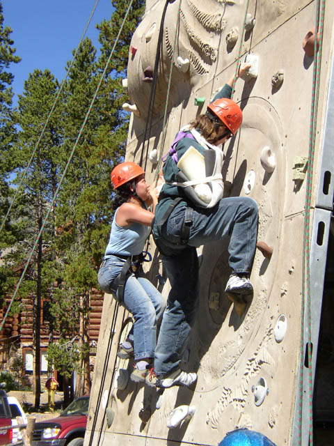 On belay, both Vikki and Marla are making steady progress up the wall.Marla is gaining more confidence as she goes!