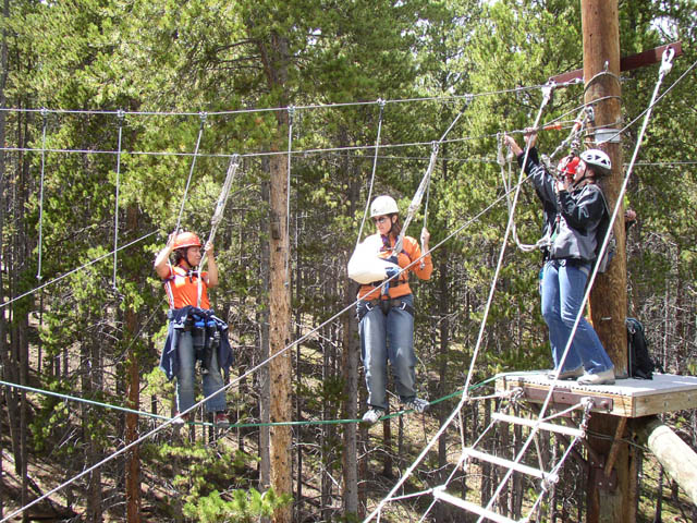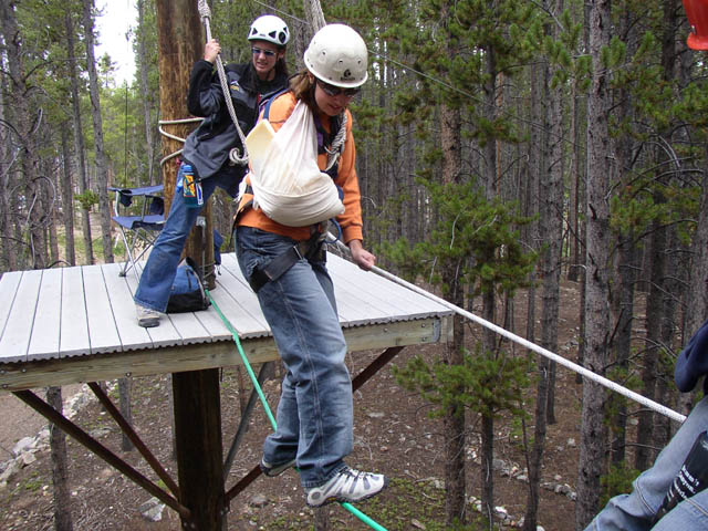 Eric Marchese helps Marla tie in to the zip line, which is a free-fall ride off the ropes course,down the cable on a pulley.