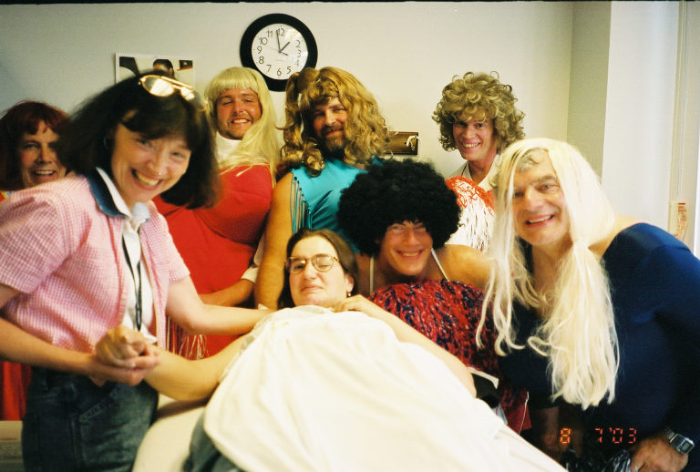 Marla, while working on the physical therapy table with PT Celeste, gets a visit from the crazy Craig staff dressed as "Bosom Buddies".