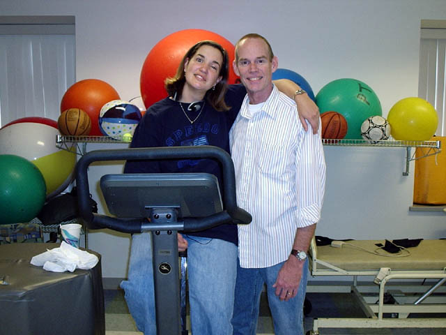 Dan Gibson, a physical therapy assistant at Craig Hospital, says hello to Marla while she works on the exercise bicycle. Dan just returned to work after undergoing back surgery.