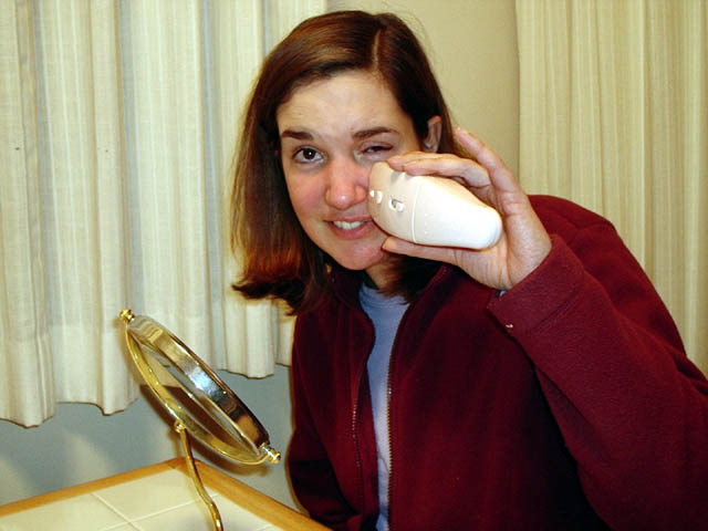 Marla works with the facial electrical stimulation device that she is using to help recover function in the nerves and muscles on the left side of her face.